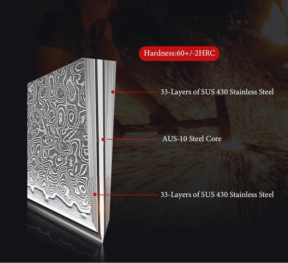 Crafted with a multi-layer steel construction and a premium high-carbon cutting core, the blade provides excellent sharpness, durable edge retention, and reliable corrosion resistance. Hardened to 60±2 HRC, it balances long-lasting performance with ease of maintenance for everyday kitchen use.