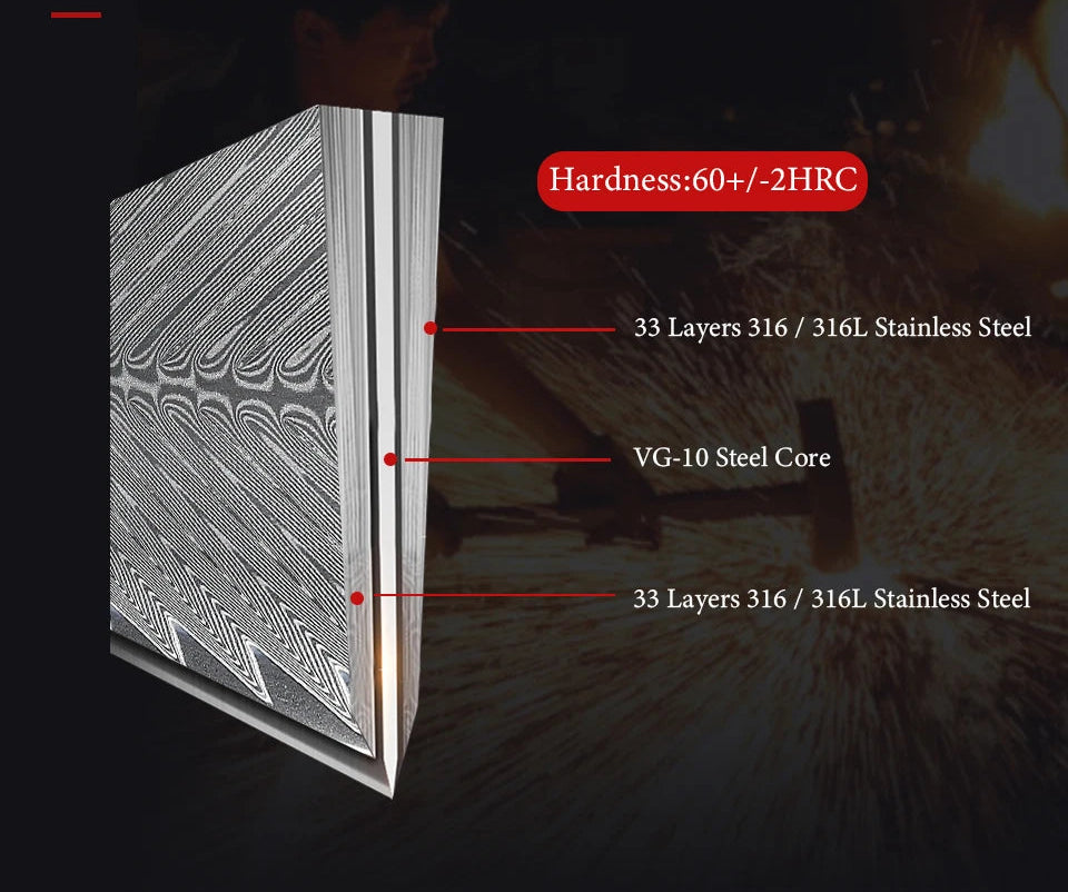 Crafted with a multi-layer steel construction and a premium high-carbon cutting core, the blade offers exceptional sharpness, strong edge retention, and excellent corrosion resistance. Hardened to 60±2 HRC, it provides a durable, long-lasting edge while maintaining reliable daily performance.