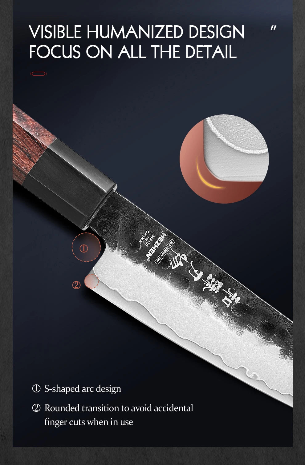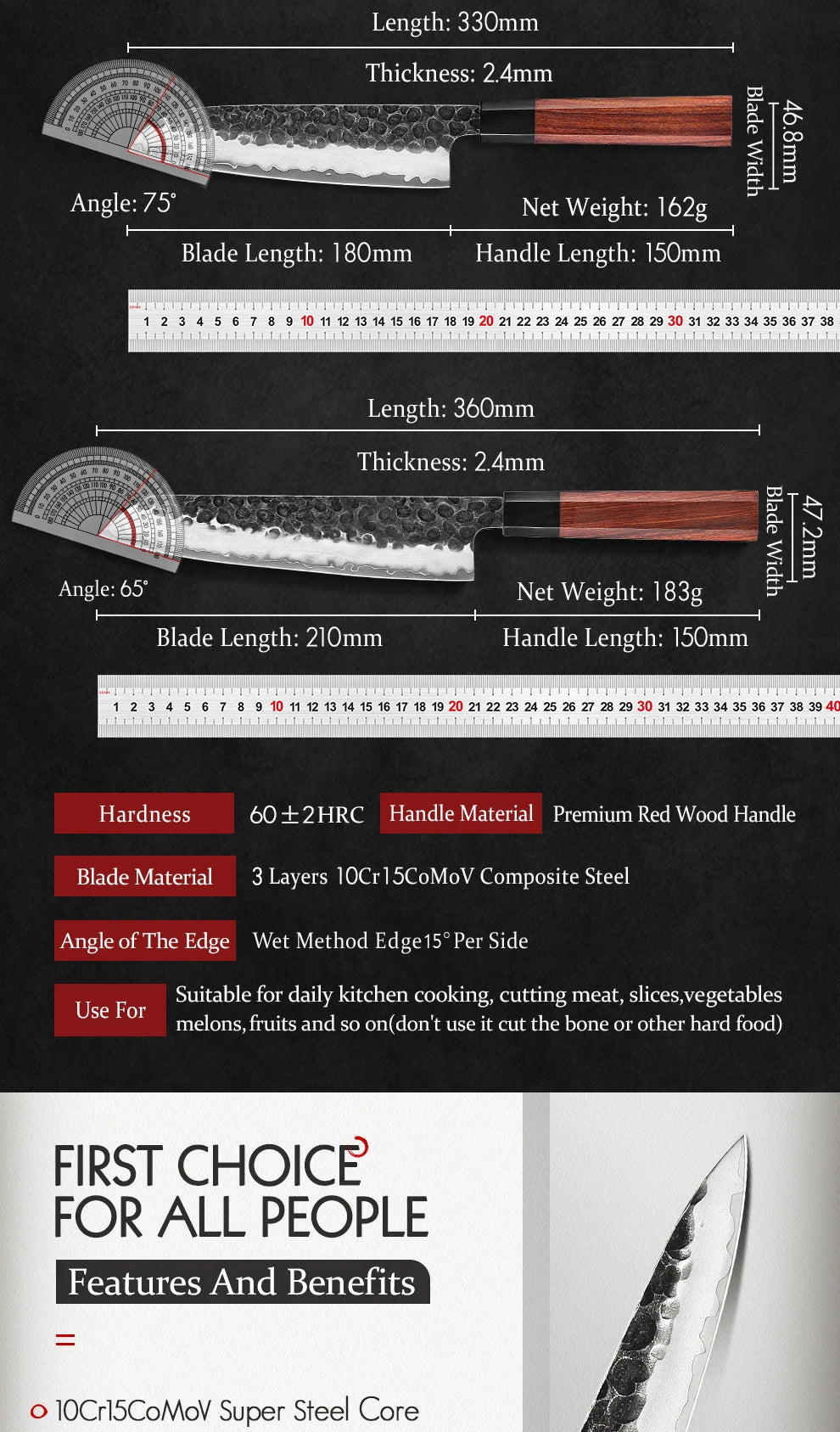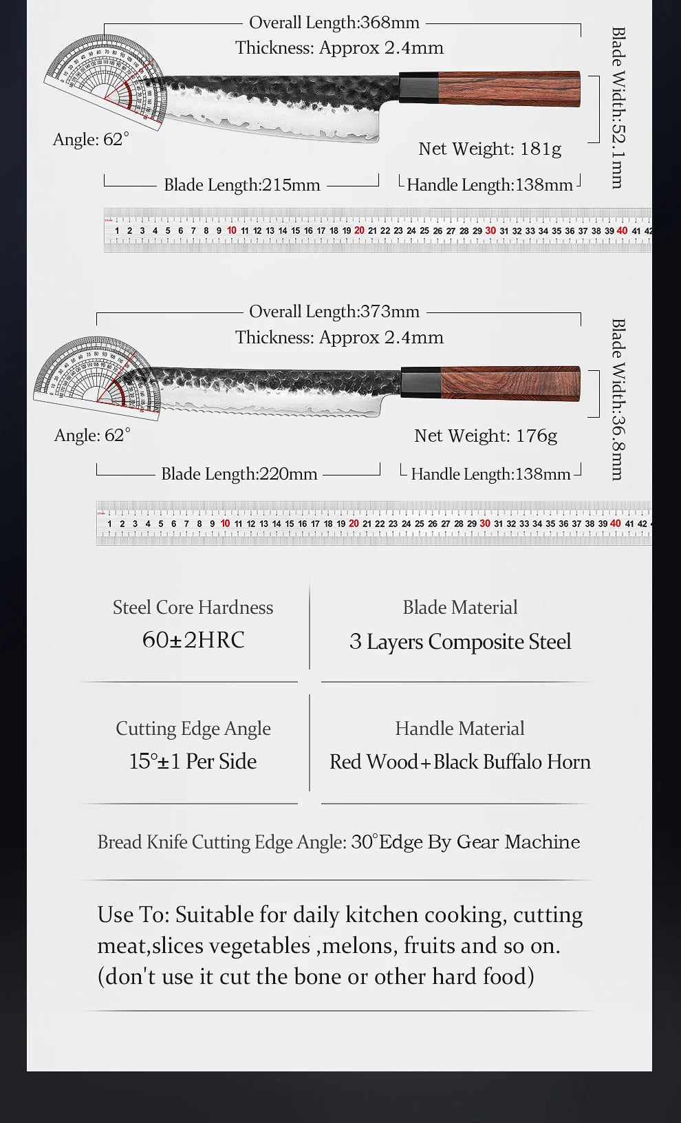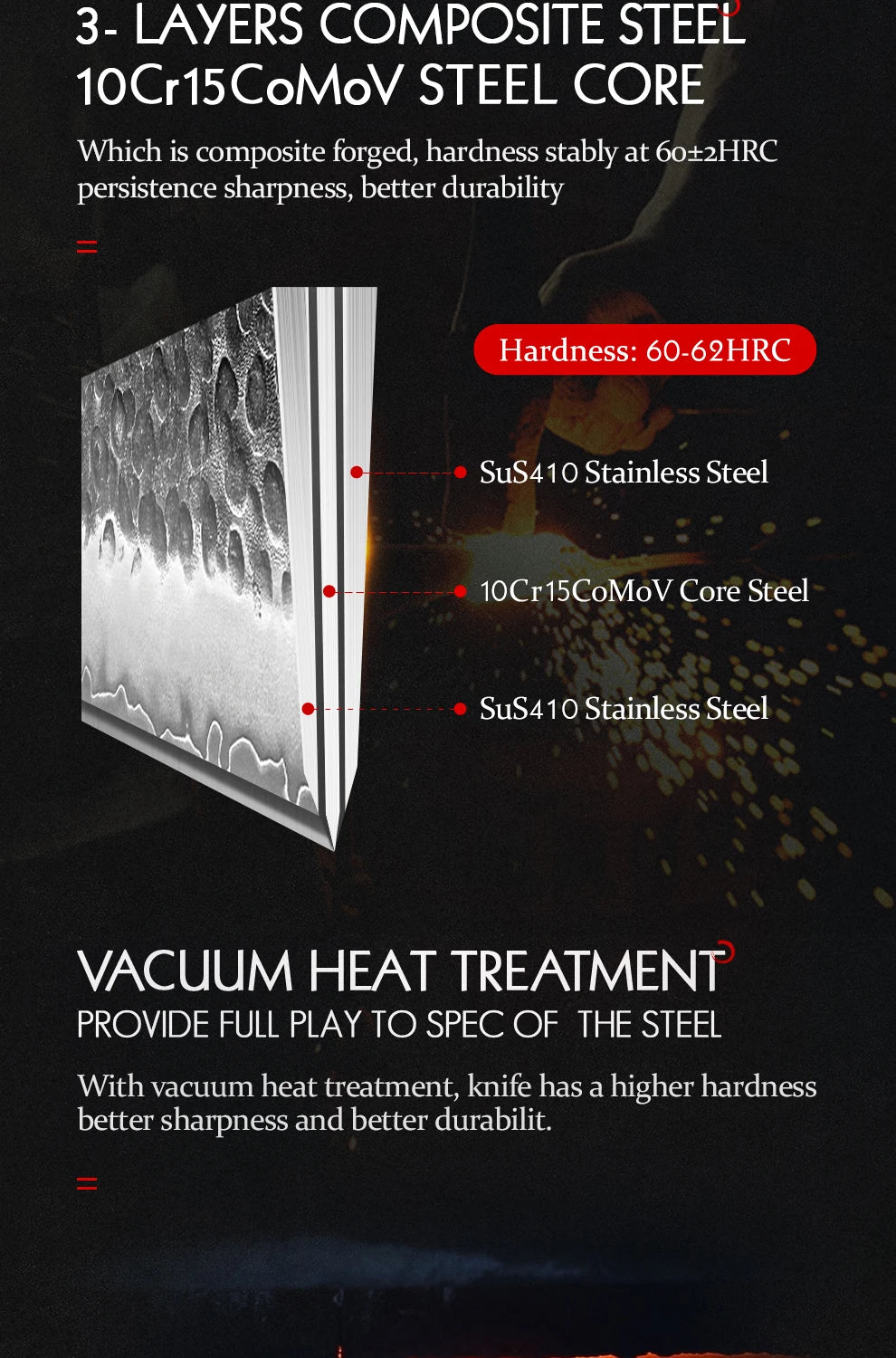 - 3-layer composite steel with hard core for sharpness and durability