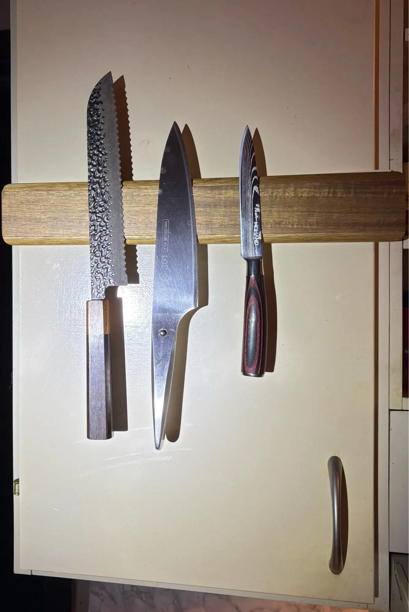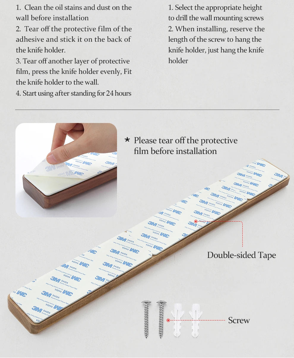 This works great. The knifes are steady but still easy to remove and attach. I also like the 3m double sided tape that fits perfectly and can be used instead of screws to attach it.