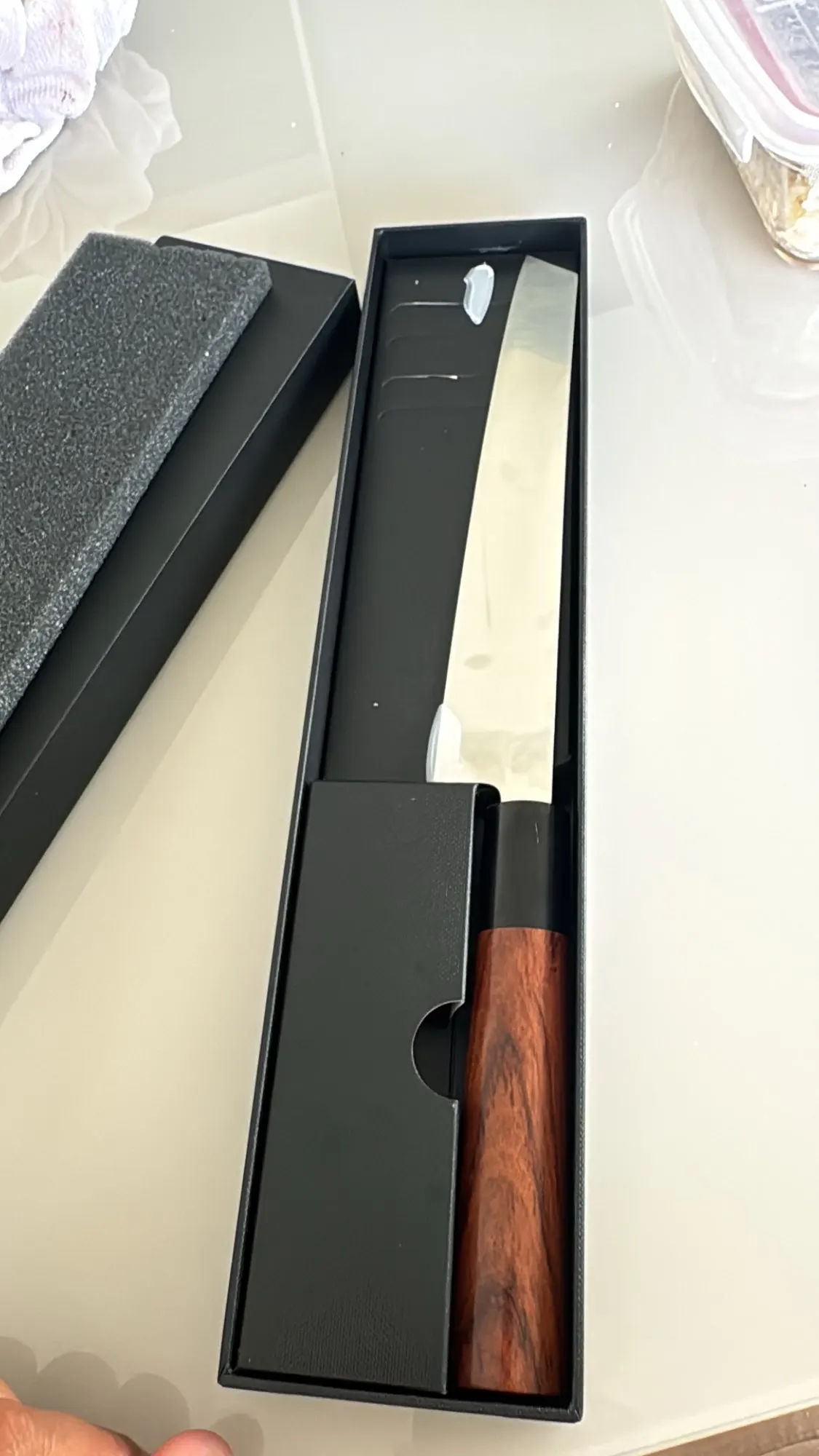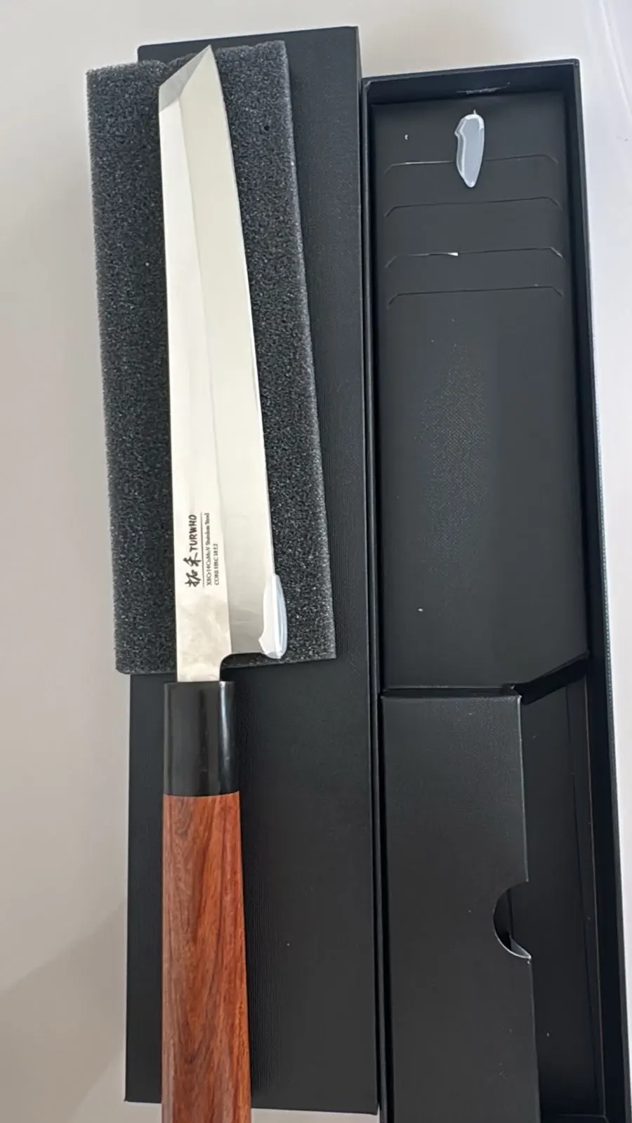 The handle combines ebony and rosewood, offering a comfortable, secure grip with a natural wood finish that complements the knife’s elegant design. At approximately 206g, it feels balanced in hand without unnecessary weight.