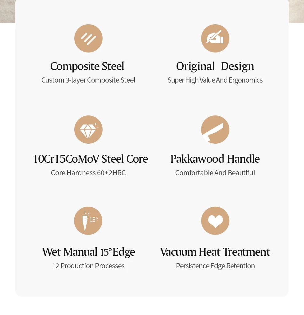 Engineered for precision and performance, this knife features a 10Cr15CoMoV steel core within a three-layer composite steel structure, delivering exceptional sharpness, strength, and edge retention. Heat-treated to 60±2 HRC with a 15°±1 edge per side, it provides clean, effortless slicing with lasting durability. A finely polished finish enhances corrosion resistance, while the Japanese-style pakkawood handle with copper flower rivets ensures balance, comfort, and refined detail.
